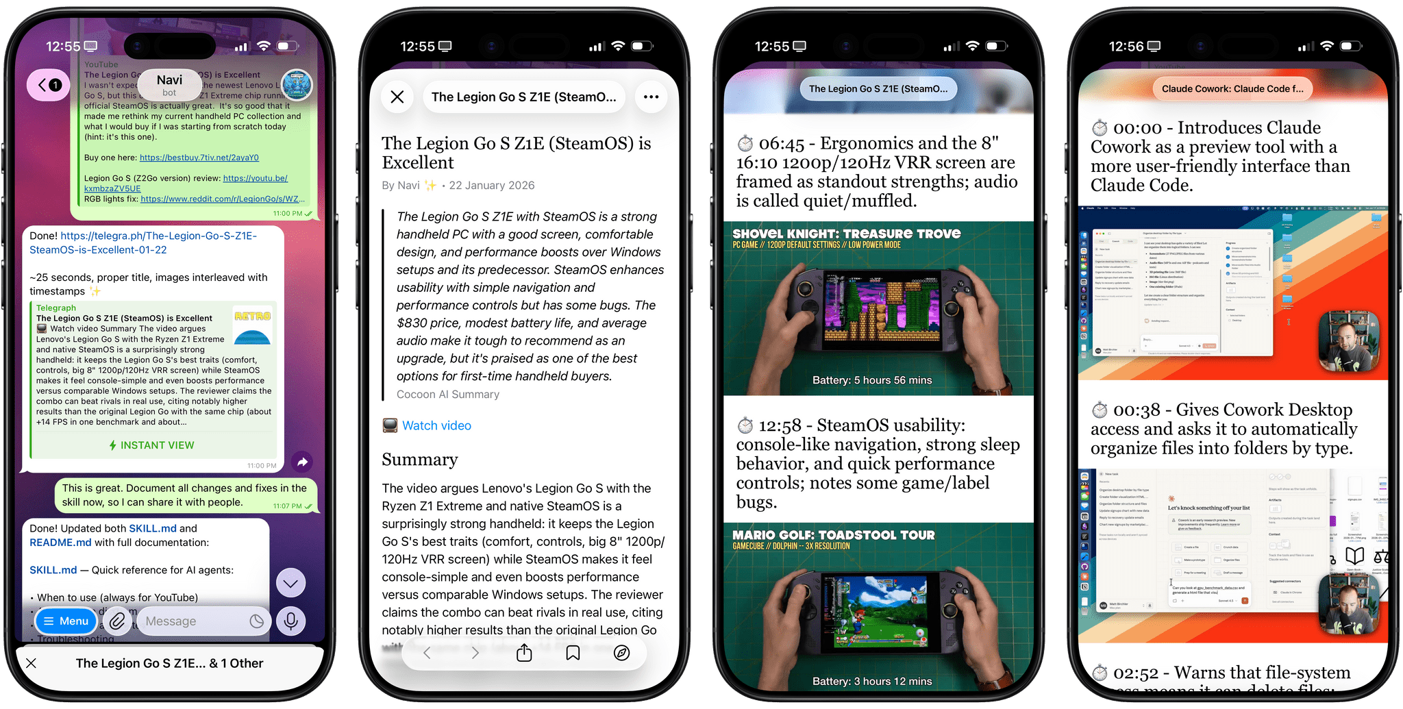 Transform YouTube videos into Telegraph Instant View articles with visual slides and timestamped summaries.